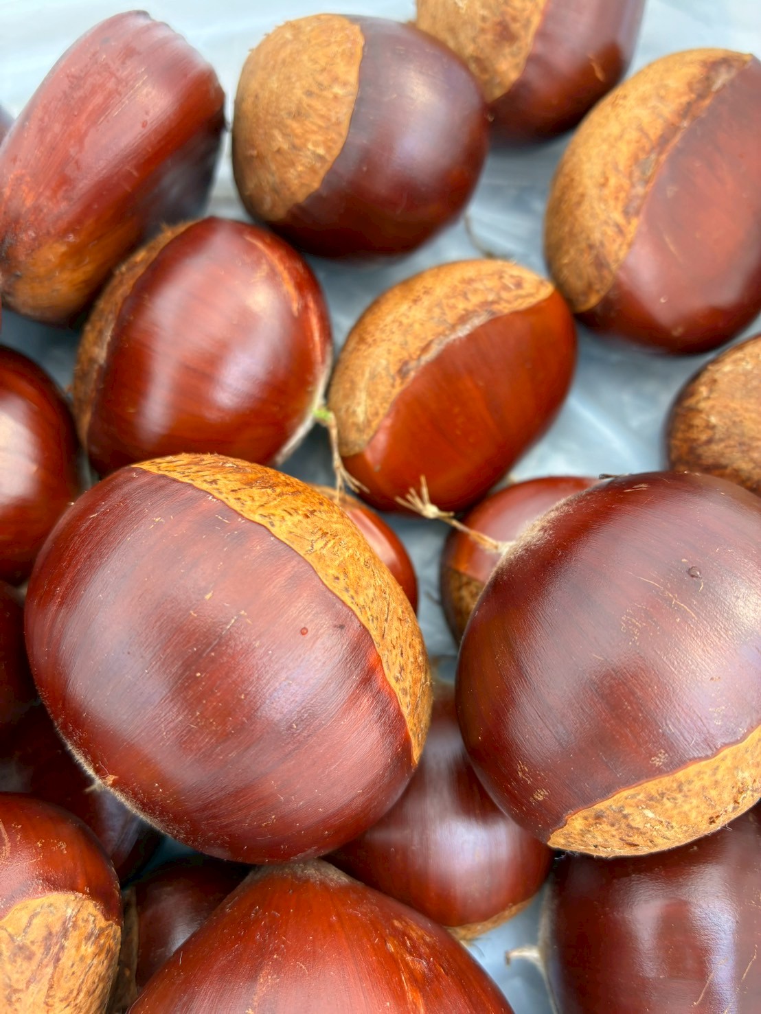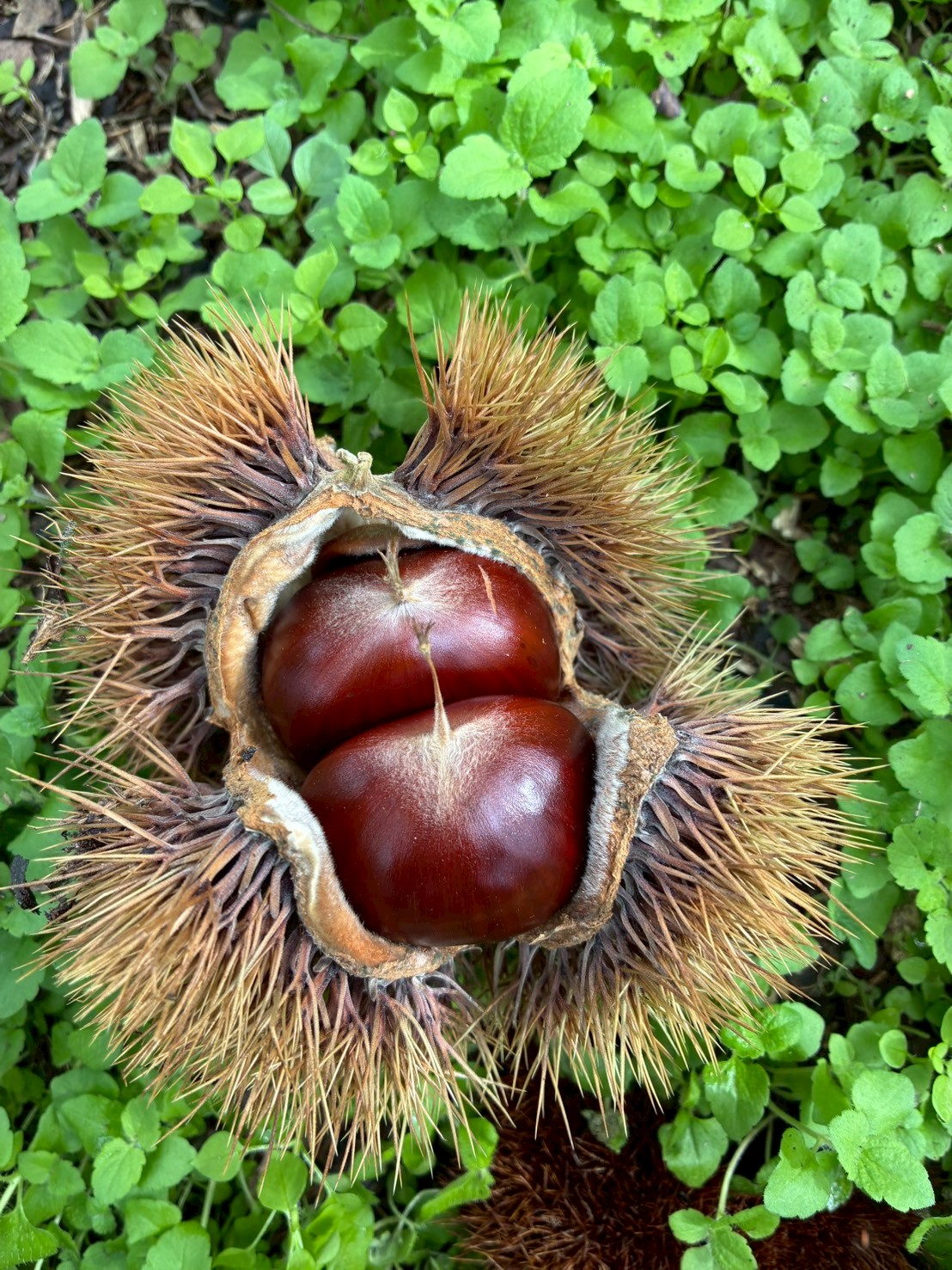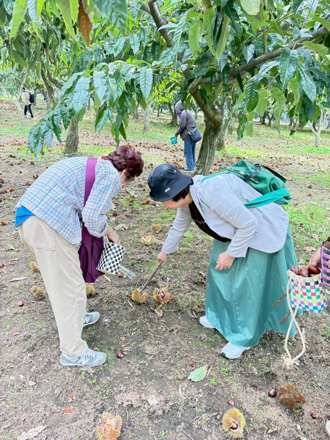 イガの中に入っている栗を拾うイメージいっぱいの参加者の皆さんでしたが、地面に落ちている栗も立派なものがいっぱい。木の上でイガが開いて落ちてきているのでした。小高い山にある栗の林に入り、受け取った籠で1キロ収穫する栗拾いでした。最初は山を登るのは・・・とおっしゃっていた方も、拾い出すと一生懸命になり、最後には「おもしろかった~」と満足の笑顔が。横幅5センチを超すツヤツヤの栗もあり、見事なものでした。